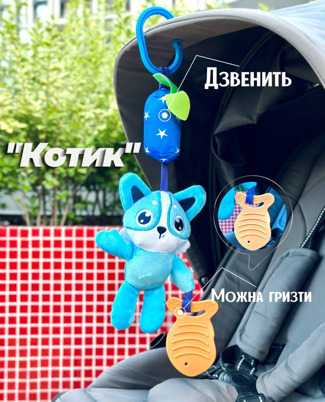 • Можна підвісити на дугу килимка, ліжечка або візочок;